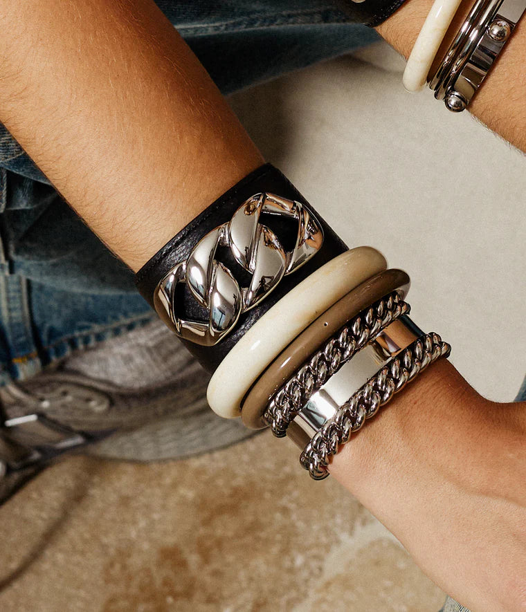 Avec un diamètre de 6 cm et une largeur de 4,5 cm, cette manchette offre une belle présence au poignet tout en restant agréable à porter. Le cuir apporte souplesse et confort, tandis que les maillons en acier renforcent son allure contemporaine.