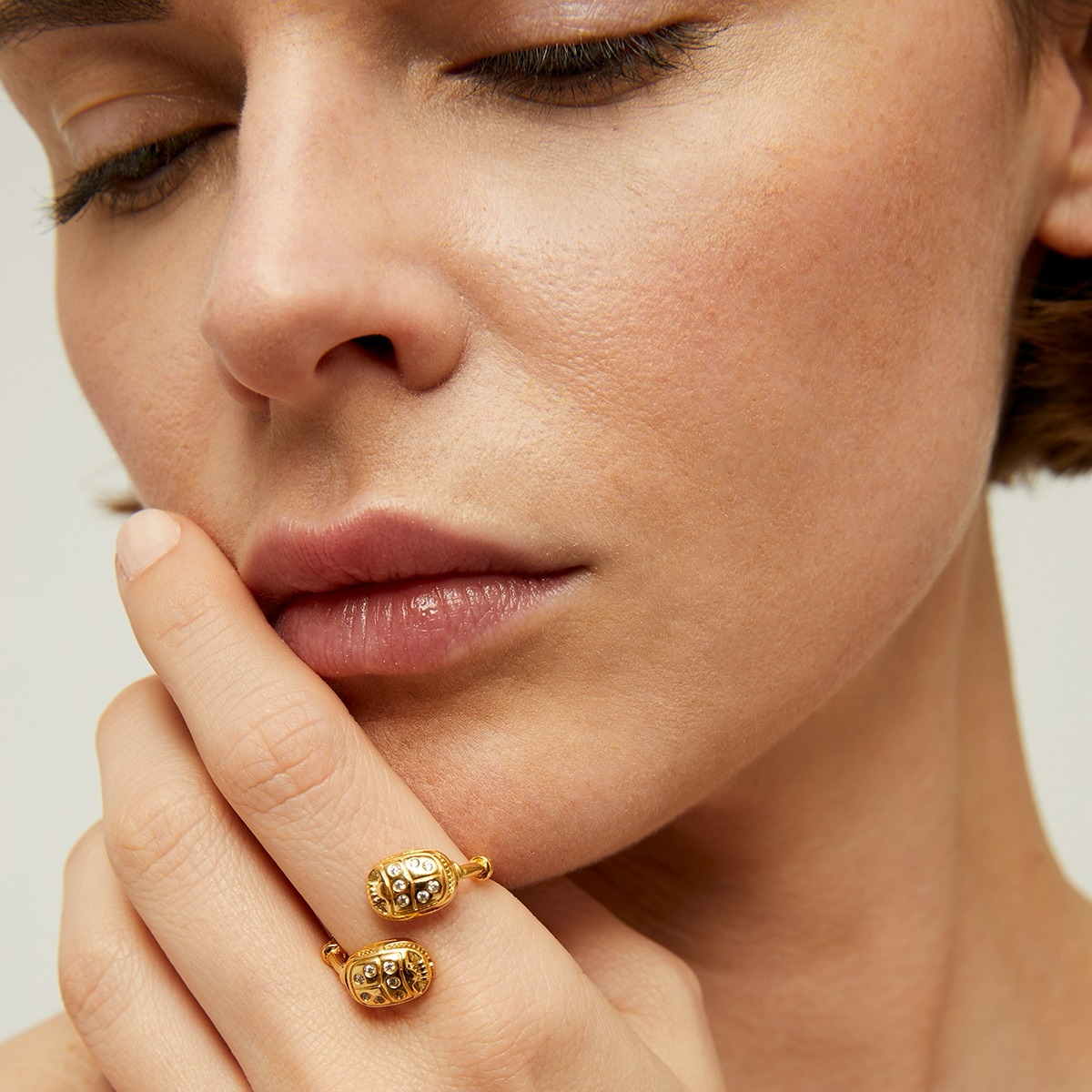 Ornée de deux scarabées finement gravés à la main, cette bague évoque la dualité, la protection et la renaissance. Chaque détail est pensé pour offrir une pièce expressive, à la fois élégante et affirmée, sublimée par un métal doré à l’or fin à l’éclat chaleureux.