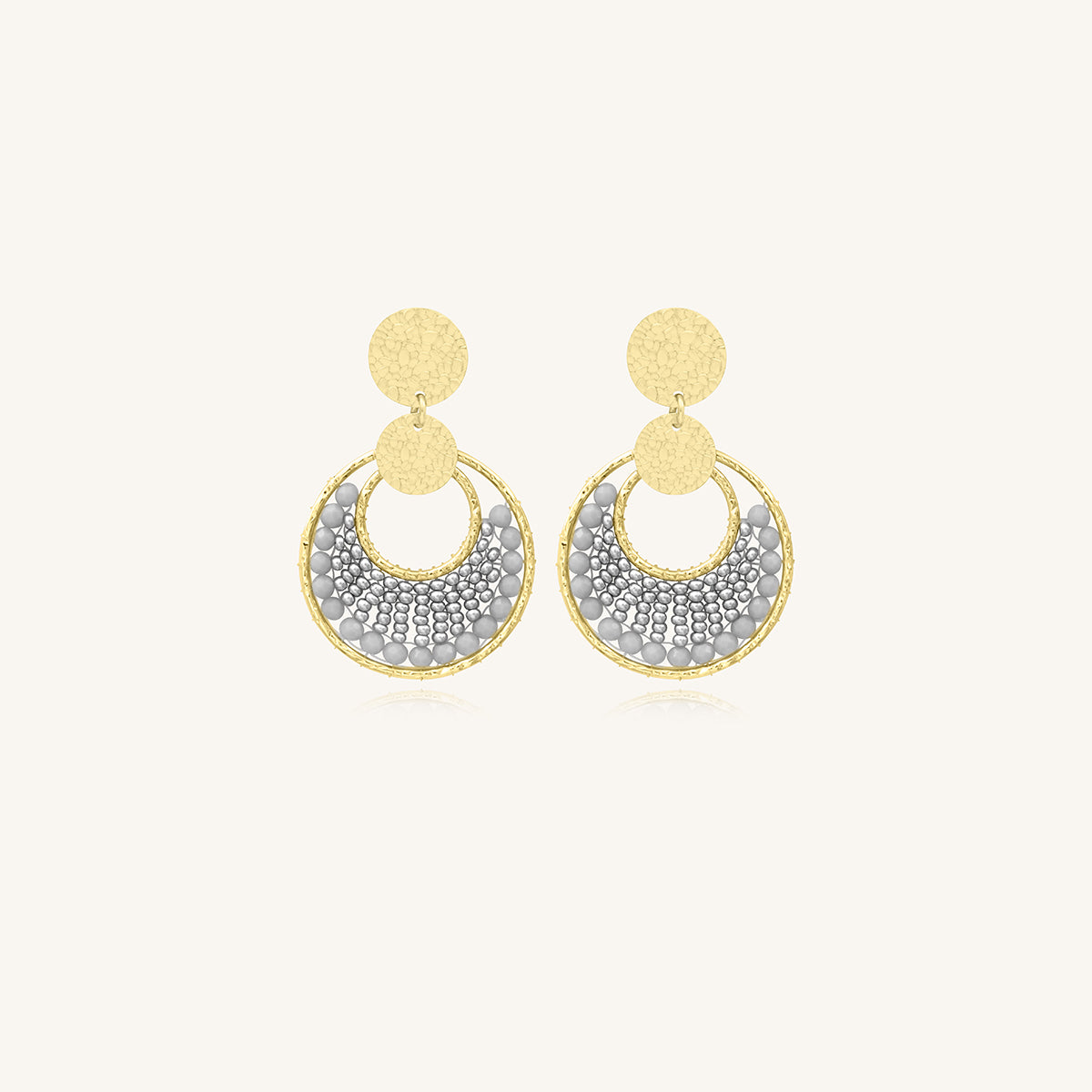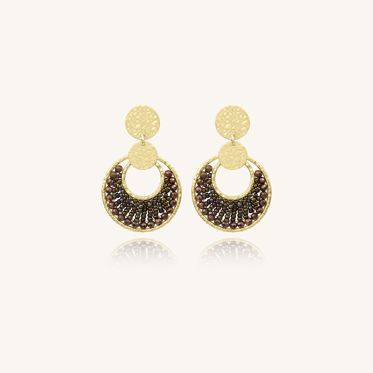 Les boucles d’oreilles Mini Luna sont fabriquées à la main avec soin. Elles mélangent des petites pastilles dorées martelées à des perles et des cristaux brillants pour un rendu délicat et lumineux.