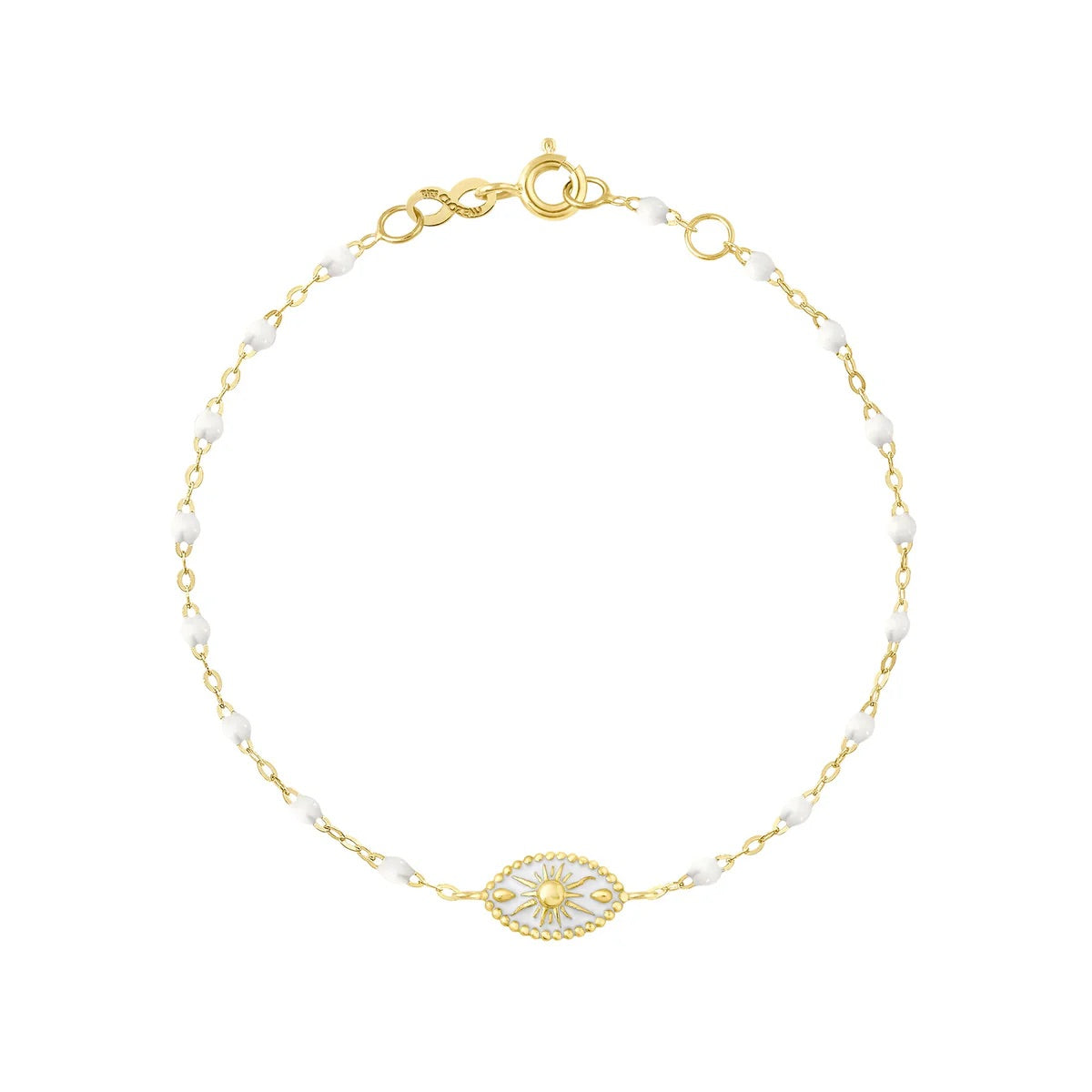 Bracelet or jaune 750 millièmes agrémenté de perles de résine et d'une médaille "Karma" 750 millièmes sertie de résine (coloris identique aux perles).Son pendentif au contour finement perlé incarne un talisman précieux, à la fois protecteur et lumineux.
