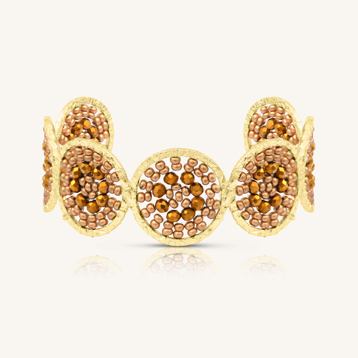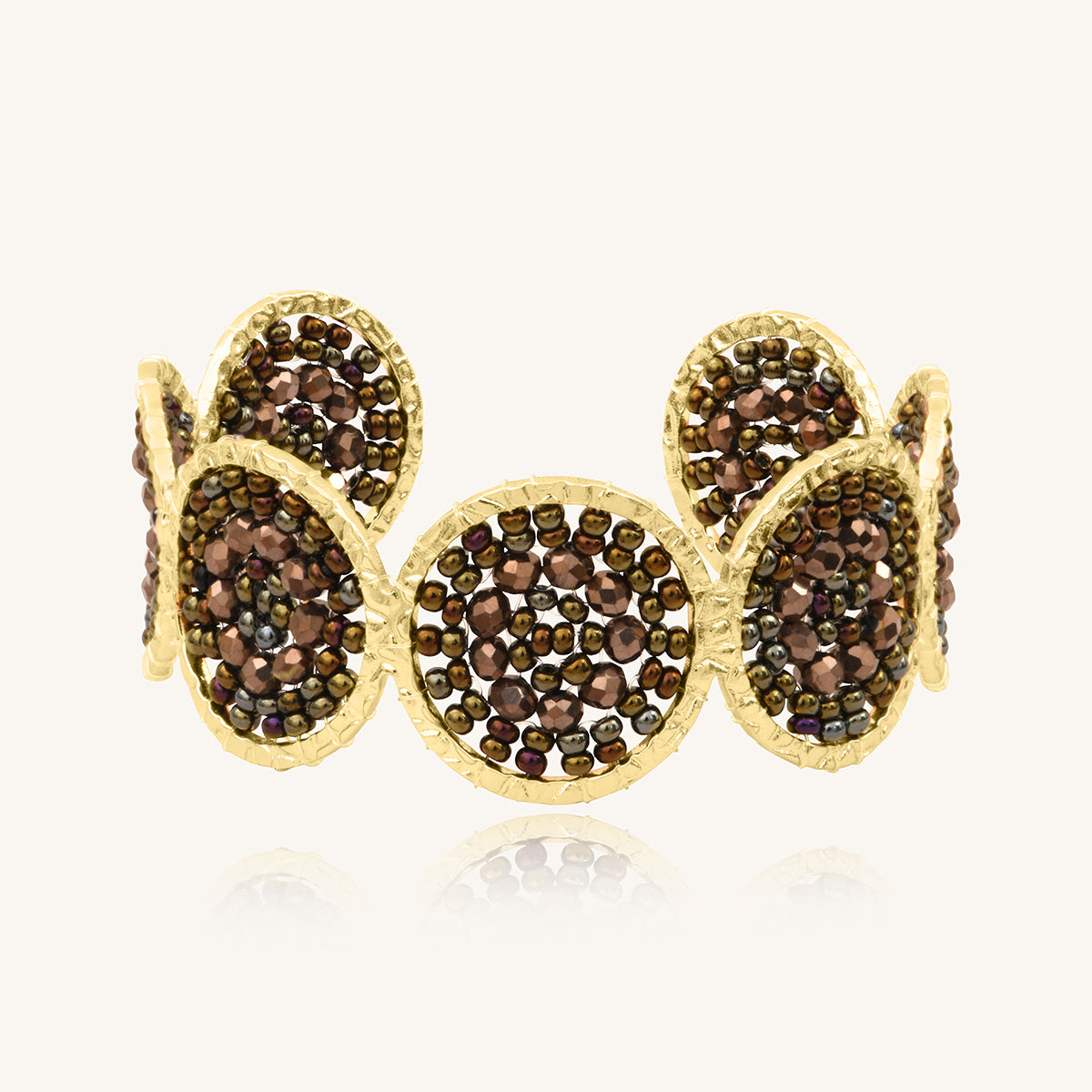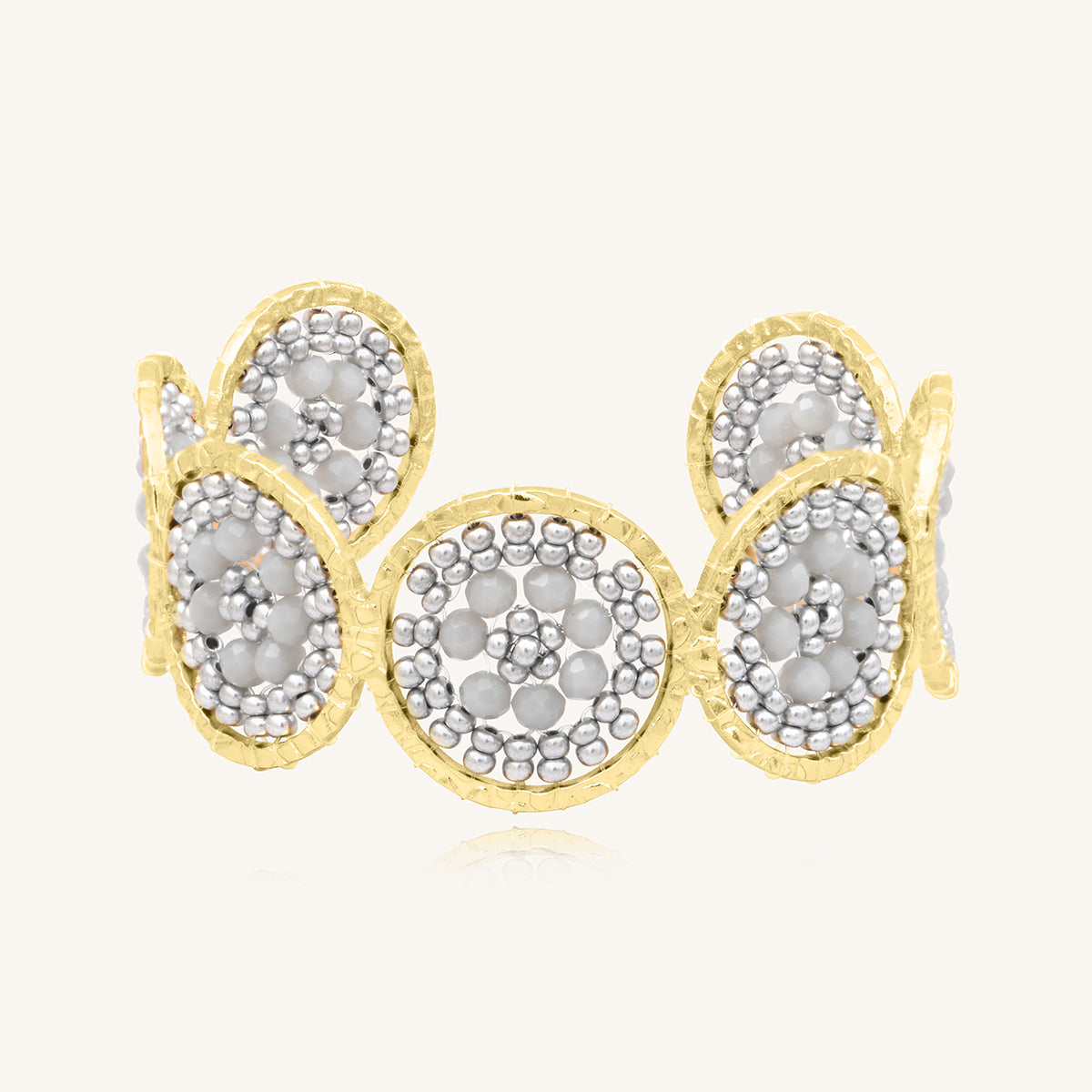 Jolie base martelée, tissée à la main grâce à un fil transparent qui permet de relier les perles et cristaux colorés entre eux.