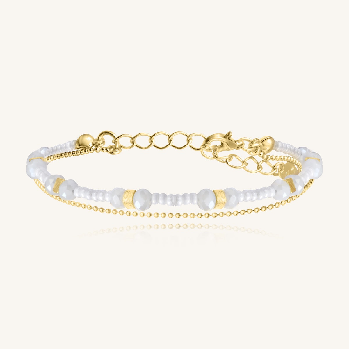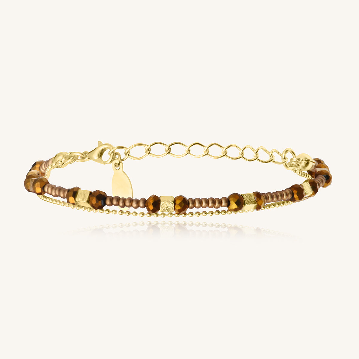Le Bracelet Divine 1 Tour Carré incarne l'élégance minimaliste. Ses perles et cristaux, sublimés par des carrés dorés à l'or fin, composent une harmonie de reflets subtils autour du poignet. Disponible en 17 teintes de saison, ce bracelet s'associe parfaitement à vos boucles Sàntibé pour un style raffiné et coordonné.