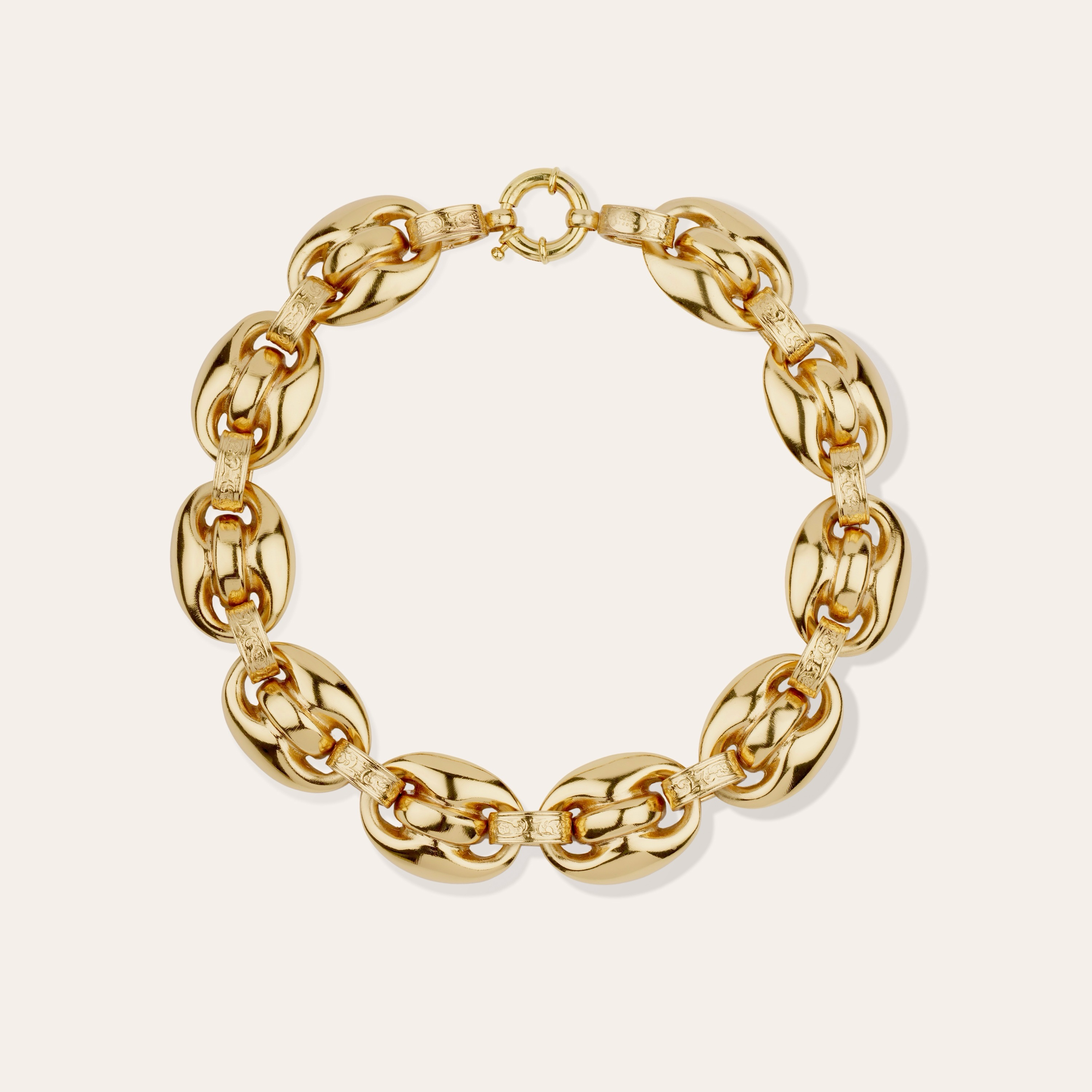 Chaque maillon est soigneusement travaillé et sublimé par des anneaux délicatement gravés, apportant du relief et une signature visuelle unique. Le métal doré à l’or fin confère au bijou une brillance chaleureuse et durable, idéale pour sublimer aussi bien une tenue du quotidien qu’un look plus habillé.