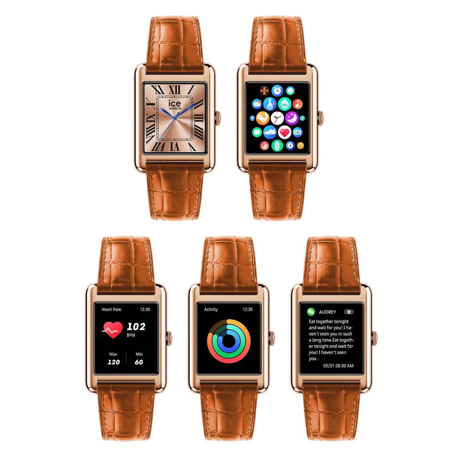Adoptez un style affirmé avec la ICE Smart TKS 2.0 Rectangulaire Rose-Gold Cognac, une montre connectée qui allie sophistication, confort et performance.