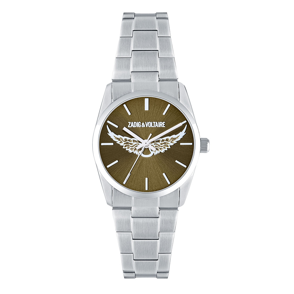 Découvrez la nouvelle montre Zadig & Voltaire ZVW1203 avec son cadran kaki orné d’ailes argentées, offrant un style distinctif et contemporain. Étanche jusqu’à 50 mètres, elle accompagne parfaitement vos activités quotidiennes. Son bracelet en acier inoxydable assure durabilité et confort, pour un porté sûr et élégant en toutes circonstances. Idéale pour les amateurs de design audacieux.