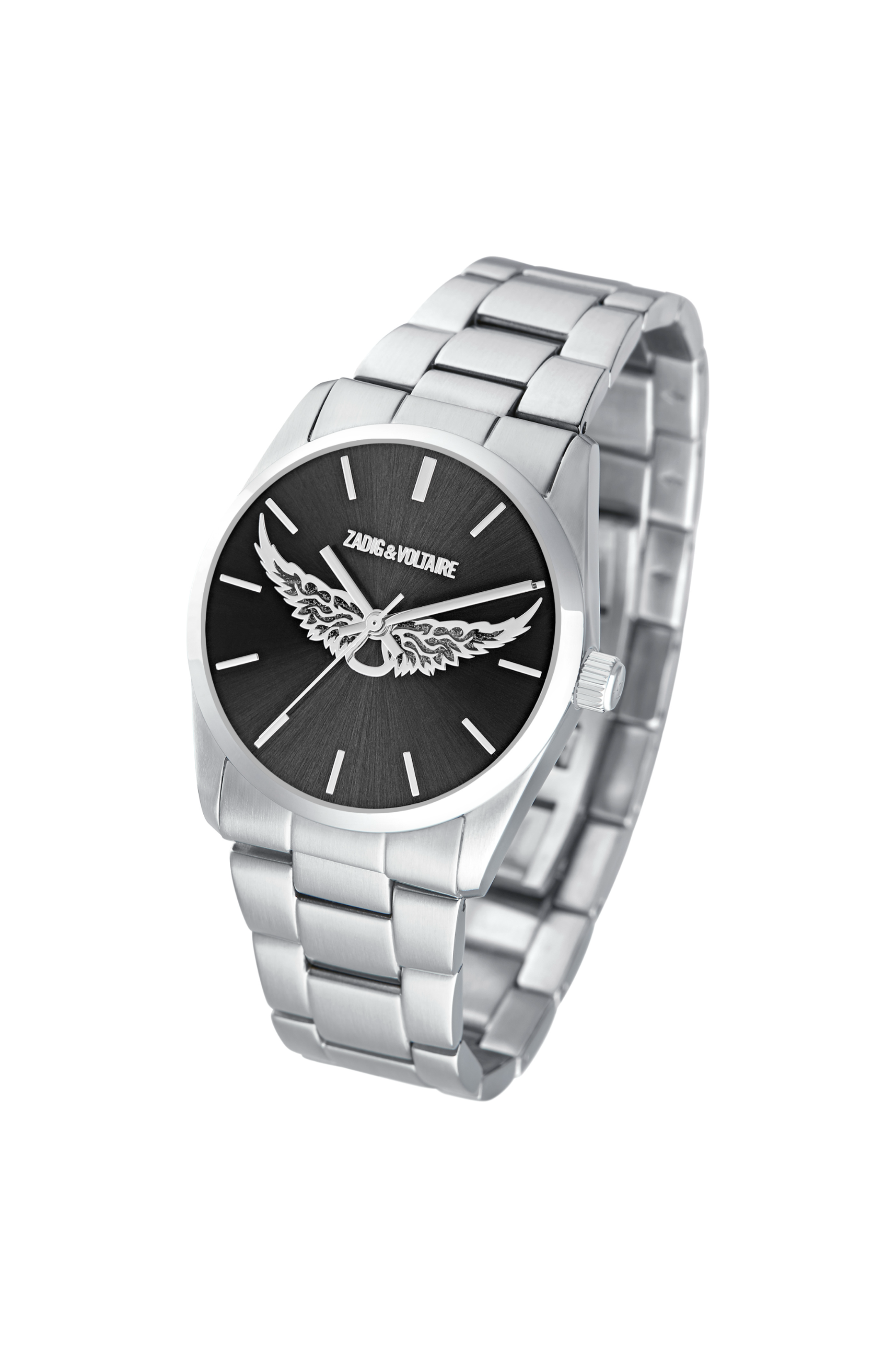 Son boîtier en acier brillant met en valeur un cadran noir intense, sublimé par les célèbres ailes argentées Zadig & Voltaire. Ce contraste fort crée une esthétique moderne et reconnaissable, idéale pour accompagner aussi bien une tenue quotidienne qu’un look plus habillé. Le diamètre de 36 mm offre un équilibre parfait entre présence au poignet et finesse.