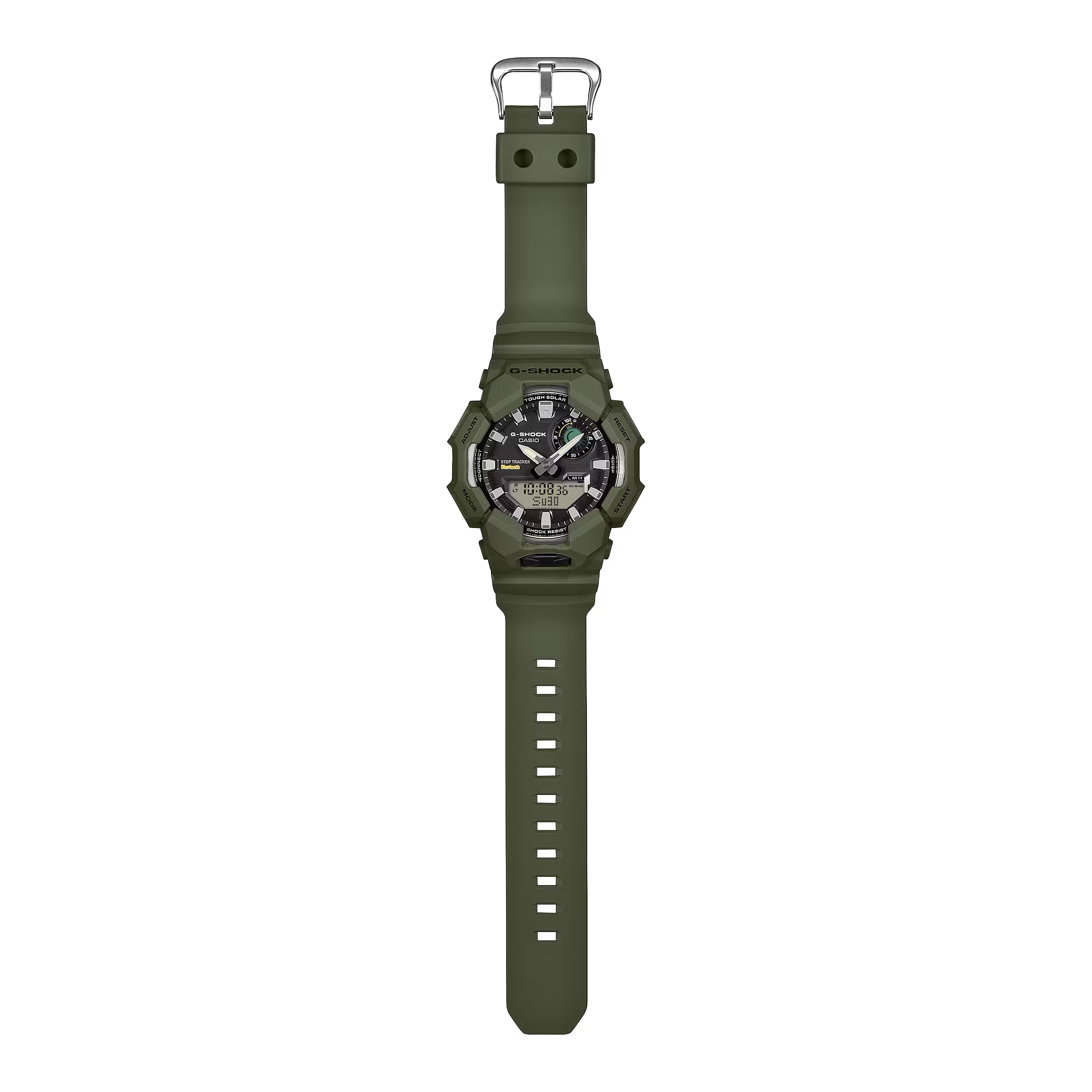 Son boîtier en résine renforcée, associé à un bracelet souple vert, assure résistance et confort au quotidien. Fidèle à l’ADN G-SHOCK, cette montre est résistante aux chocs et étanche jusqu’à 200 mètres, ce qui la rend adaptée aux activités sportives, outdoor et à un usage urbain.