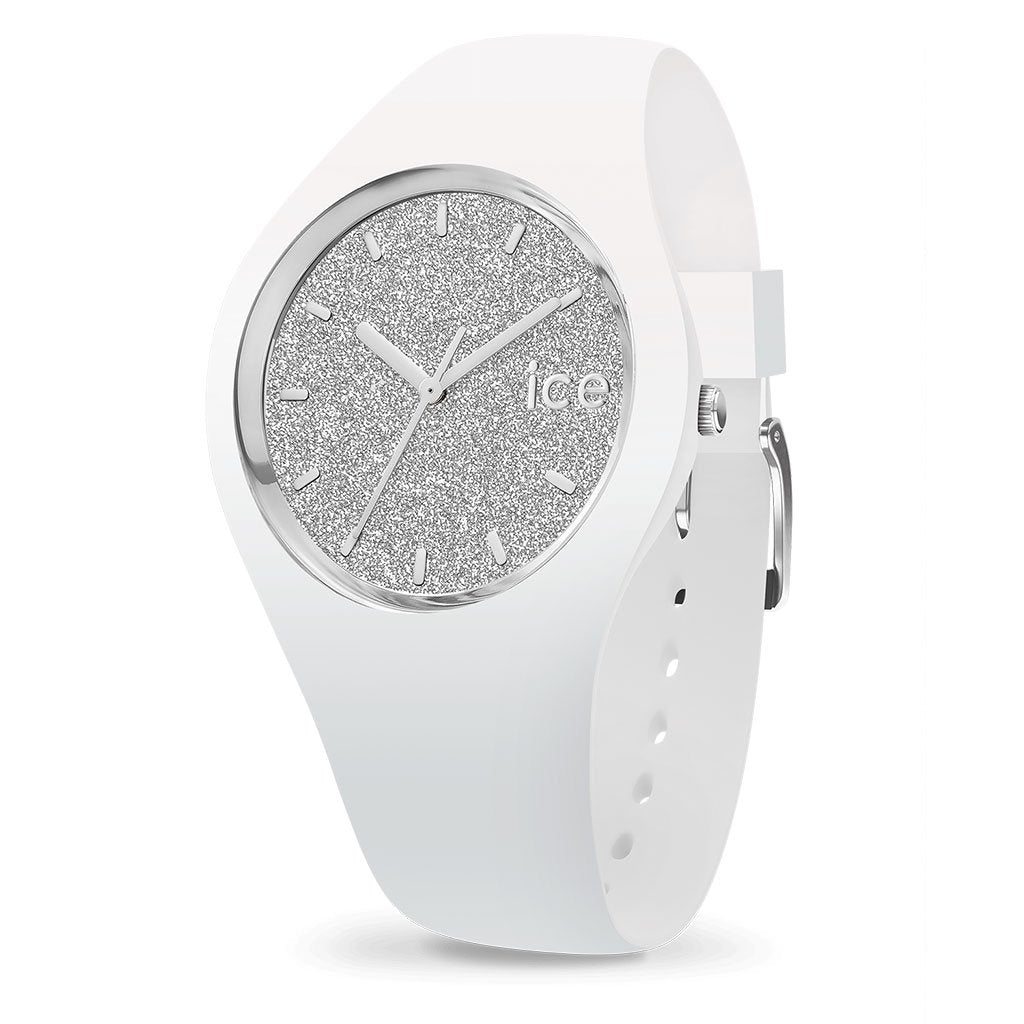 La montre Ice Glitter White Silver Small se compose d'un boitier 34mm en silicone blanc, d'une lunette grise, d'un cadran gris pailleté et d'un bracelet silicone blanc.