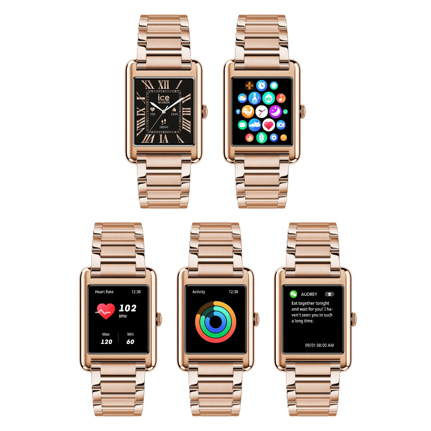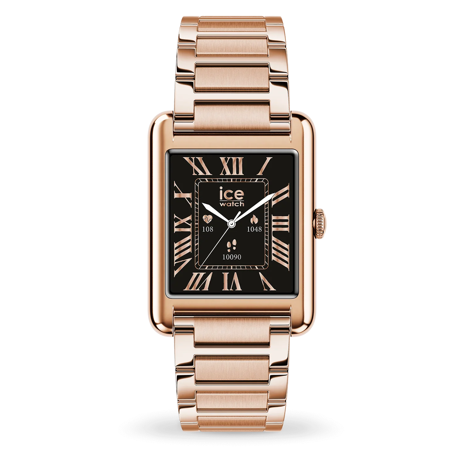 Découvrez la ICE Smart TKS 2.0 Rose Gold, une montre connectée pensée pour celles et ceux qui aiment allier élégance et technologie. Son bracelet en acier inoxydable doré rose et son boîtier rectangulaire lui confèrent un style raffiné, digne d’un bijou contemporain.