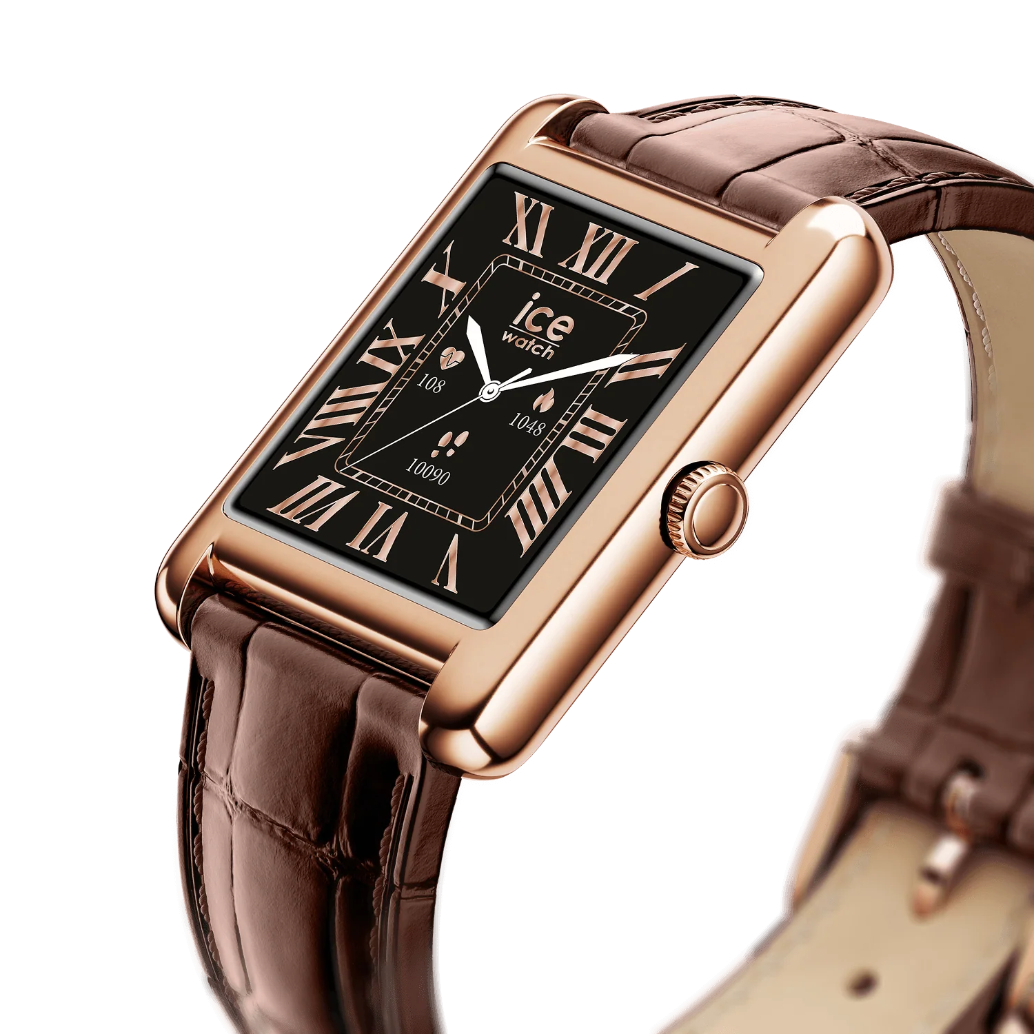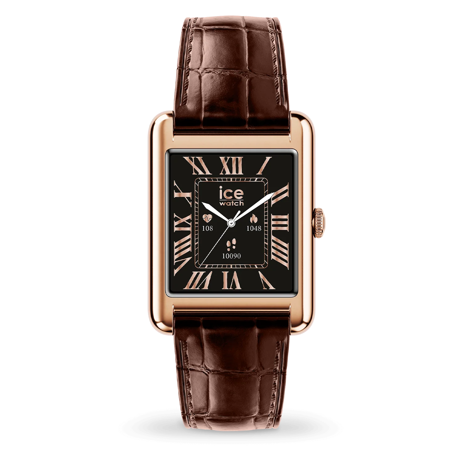 La ICE Smart TKS 2.0 Rectangulaire Rose-Gold Brown est bien plus qu’une montre connectée : c’est un accessoire qui associe design élégant et technologie avancée. Son cadran noir épuré, sublimé de chiffres romains et aiguilles rose-gold, s’accorde à merveille avec sa lunette dans le même ton, offrant une allure chic et résolument contemporaine.