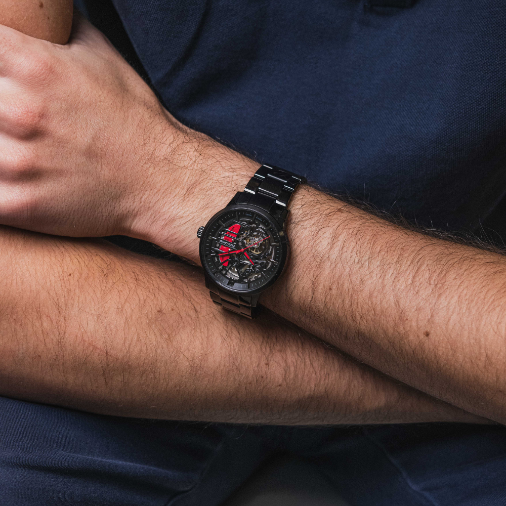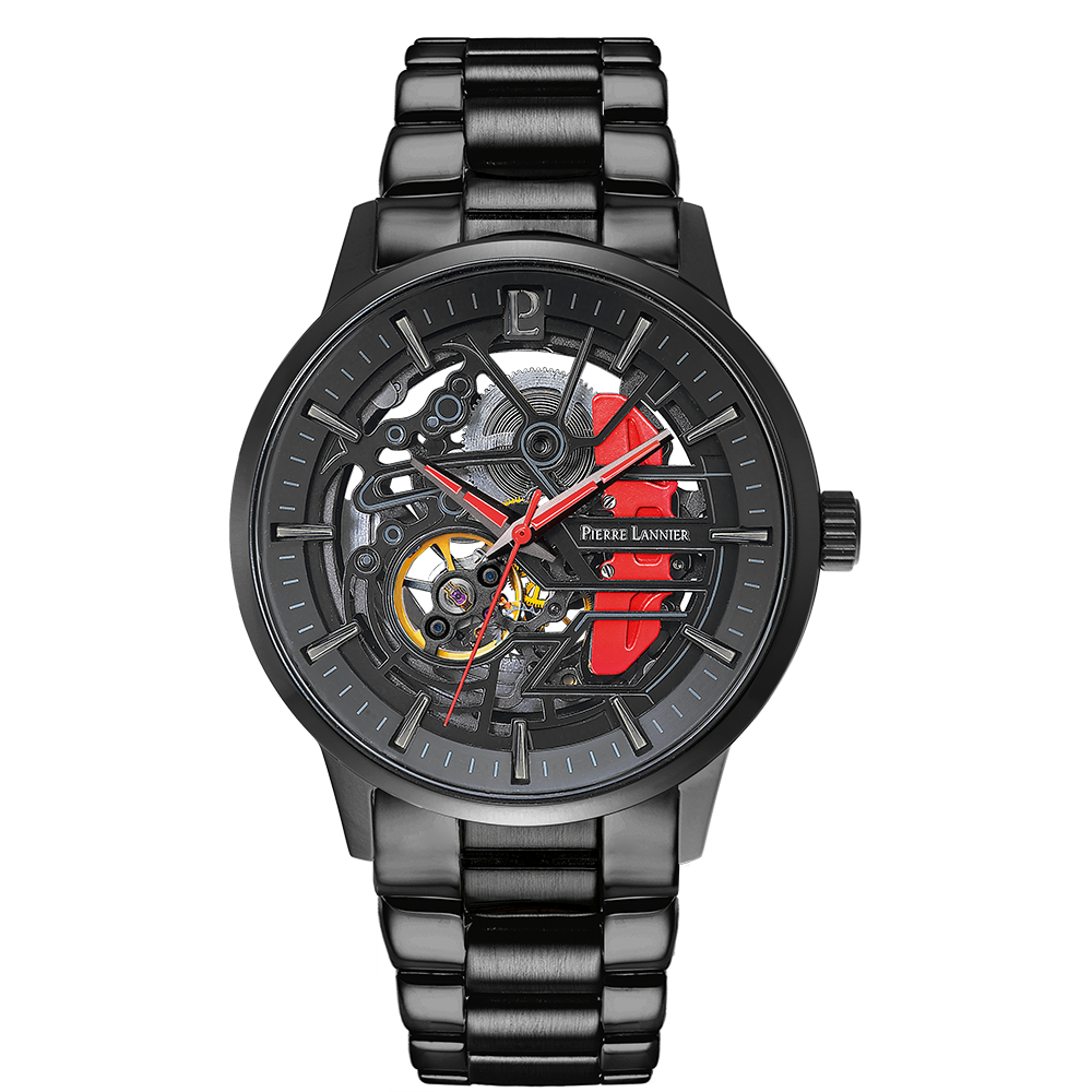 Le boîtier rond de 43 mm en acier noir assure une présence affirmée au poignet tout en respectant une esthétique moderne et raffinée. Son cadran noir semi-mat à ouverture squelette laisse apparaître le cœur du mouvement automatique.