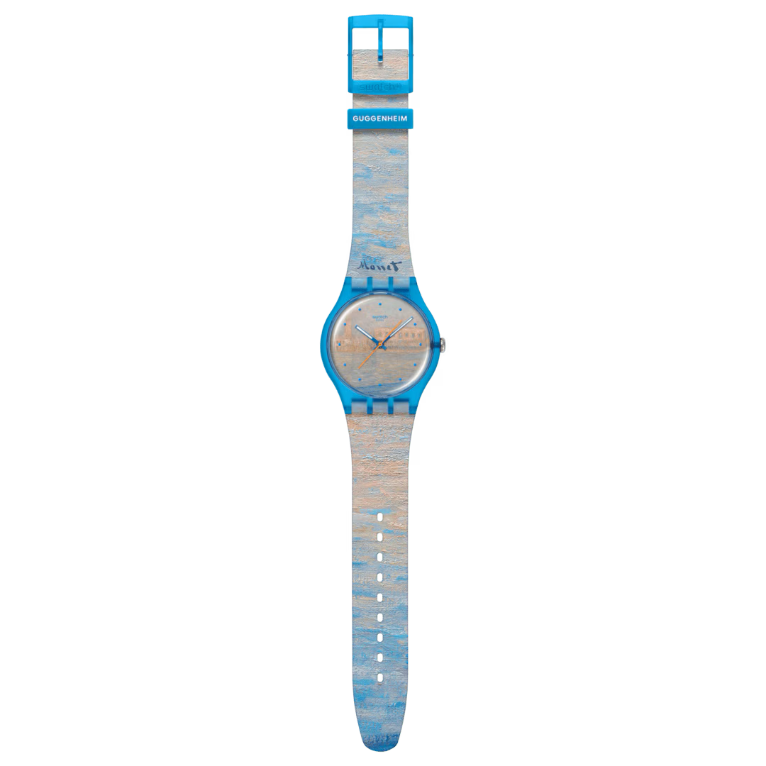 La montre Swatch Claude Monet – Le Palais Ducal vu de Saint-Georges Majeur fait partie de la collection Swatch x Guggenheim, une collaboration artistique emblématique entre Swatch et le Guggenheim Museum. Cette création rend hommage à l’œuvre impressionniste Le Palais Ducal vu de Saint-Georges Majeur (1908) de Claude Monet, maître de la lumière et de la couleur.