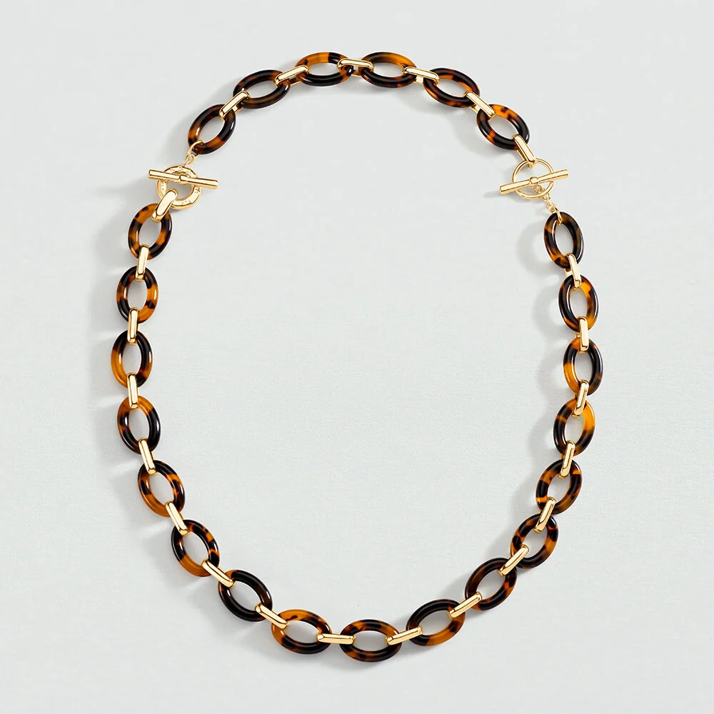 Réalisé en laiton doré à l’or 750/1000e (18 carats) et en résine, ce collier ARIA séduit par son jeu de volumes et son motif boule. Sa finition dorée contraste subtilement avec la couleur écaille multicolore, pour un rendu à la fois chic, tendance et lumineux.