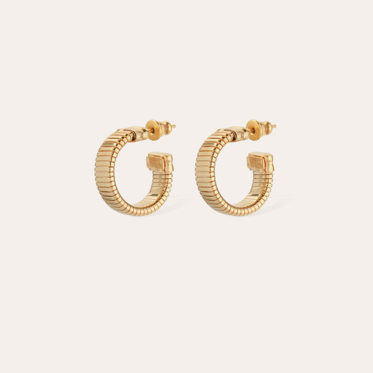 Façonnées en métal doré à l’or fin, ces mini créoles se distinguent par leur maille souple et striée, signature emblématique de la collection Milo. Les cabochons délicatement placés aux extrémités apportent une note précieuse et structurent le bijou avec élégance, tout en conservant une grande légèreté au porté.
